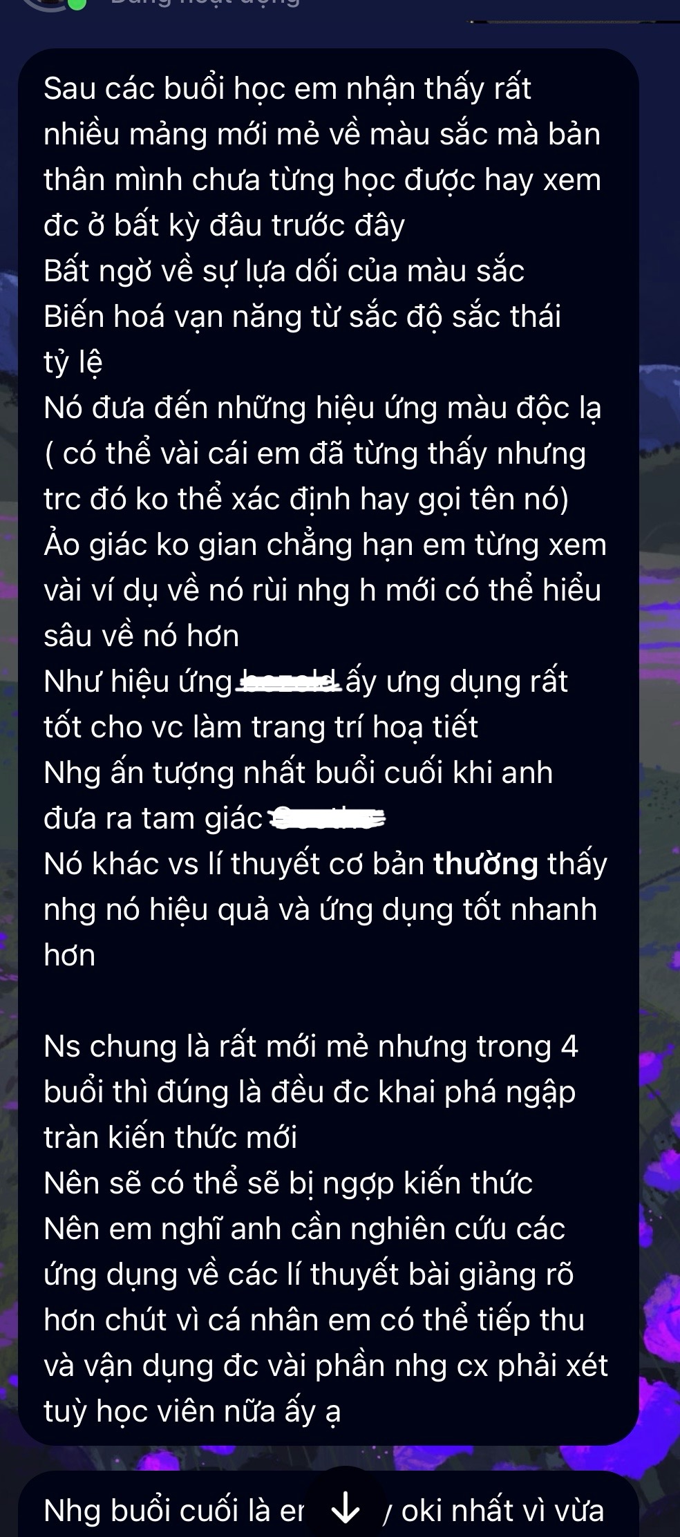 Mình nghĩ đó là do mình tập lâu thì quen, chứ các kiến thức cơ bản như vòng tròn màu hay phối màu đối xứng này kia mình lại không ứng dụng được gì nhiều.
